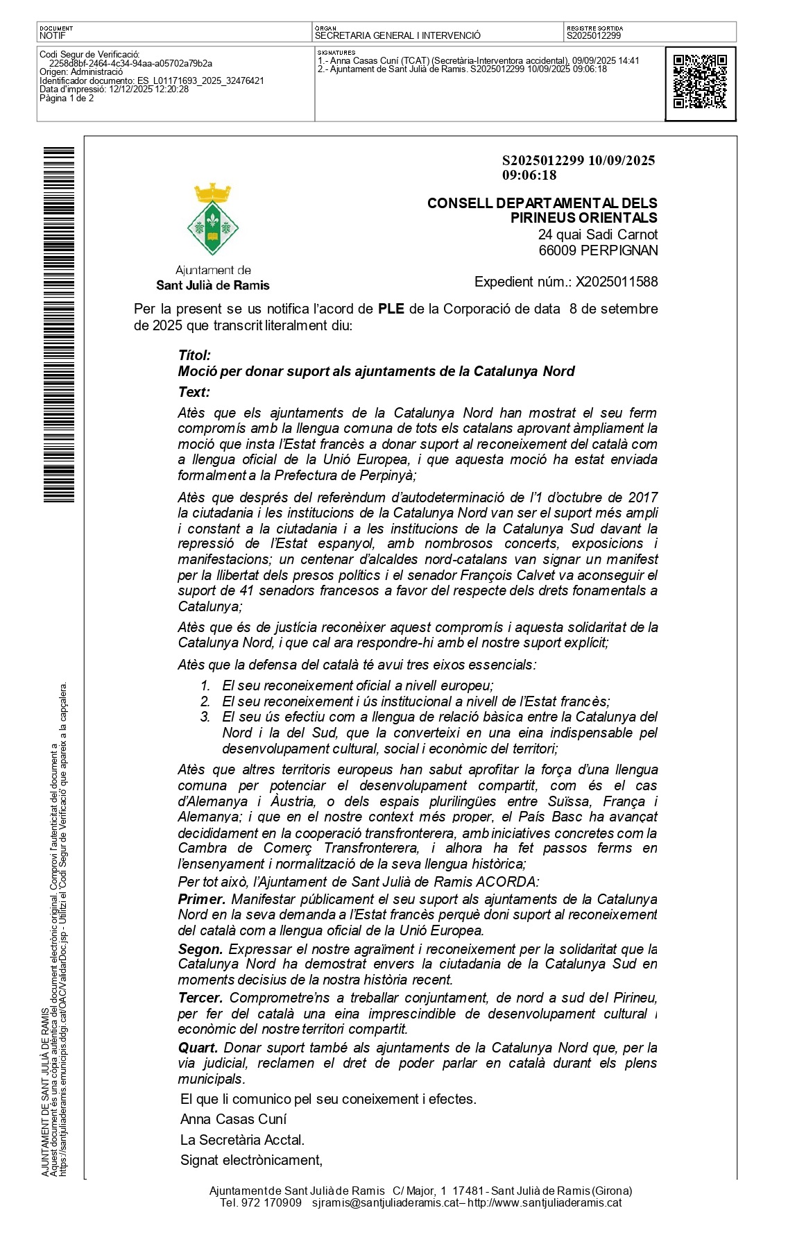 Le 8 septembre 2025, le conseil municipal de Sant Julià de Ramis a approuvé la motion portée par les Angelets de la Terra, visant à renforcer la défense de la langue catalane commune et à consolider les liens institutionnels entre la Catalogne Nord et la Catalogne Sud.