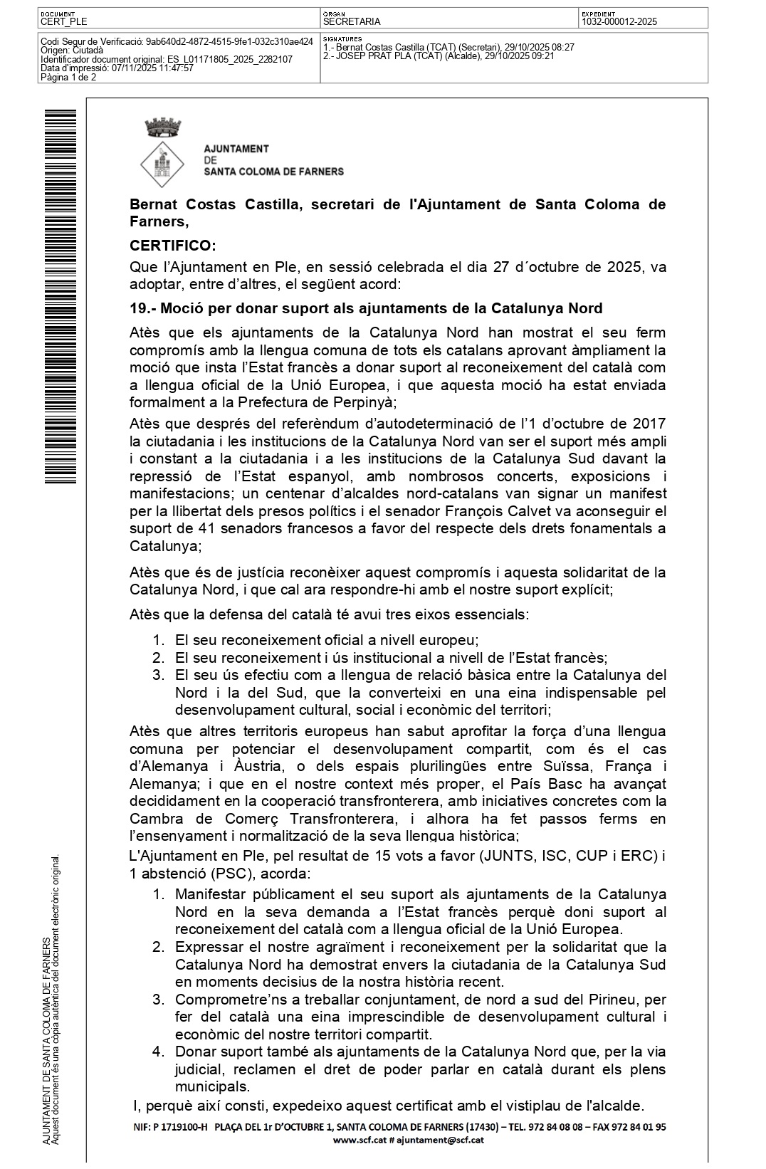 Par ce vote, Santa Coloma de Farners rejoint le réseau de communes engagées pour la défense de la langue catalane commune et pour le renforcement des liens entre la Catalogne Nord et la Catalogne Sud.