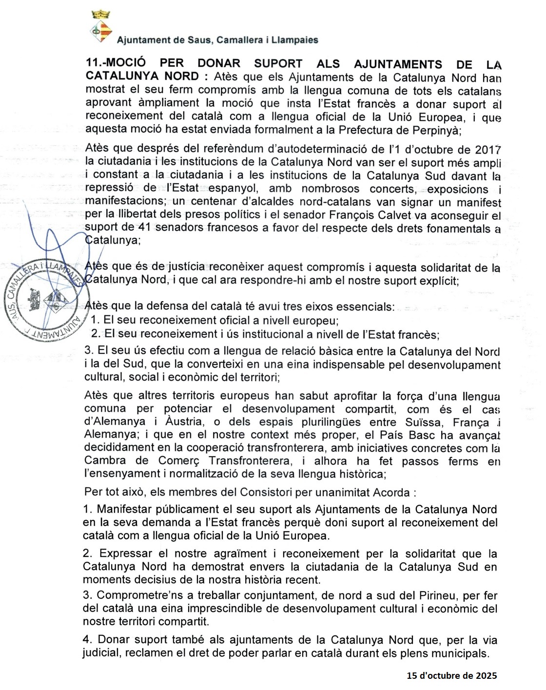 Le 15 octobre 2025, le conseil municipal de Saus a adopté la motion portée par les Angelets de la Terra, visant à renforcer la défense de la langue catalane commune et à consolider les liens institutionnels entre la Catalogne Nord et la Catalogne Sud.