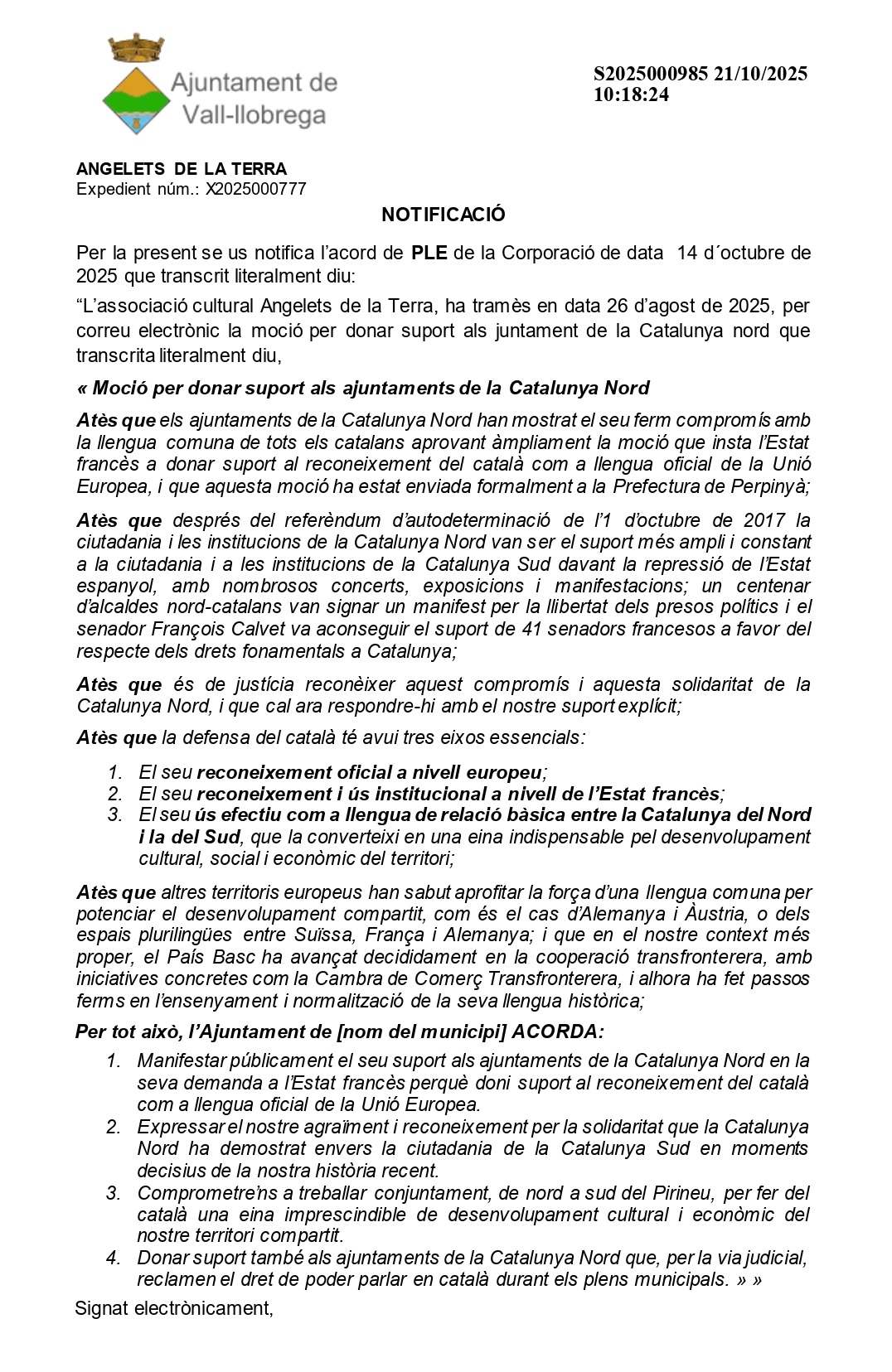Le 14 octobre 2025, le conseil municipal de Vall-llobrega a adopté la motion portée par les Angelets de la Terra, visant à renforcer la défense de la langue catalane commune et à consolider les liens institutionnels entre la Catalogne Nord et la Catalogne Sud.