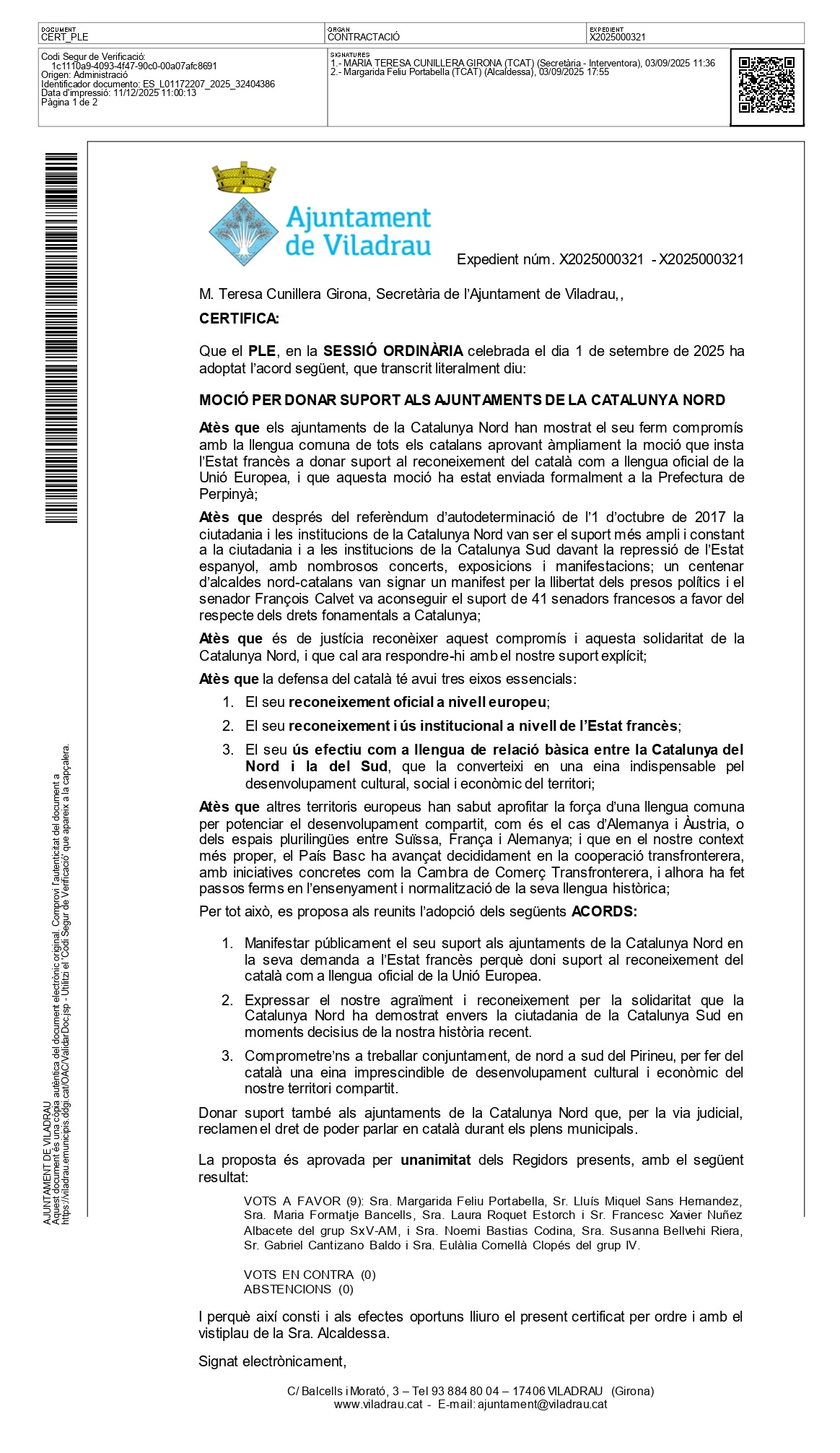 Par ce vote unanime, Viladrau rejoint le réseau de communes engagées pour la défense de la langue catalane commune et pour le renforcement des liens entre la Catalogne Nord et la Catalogne Sud.