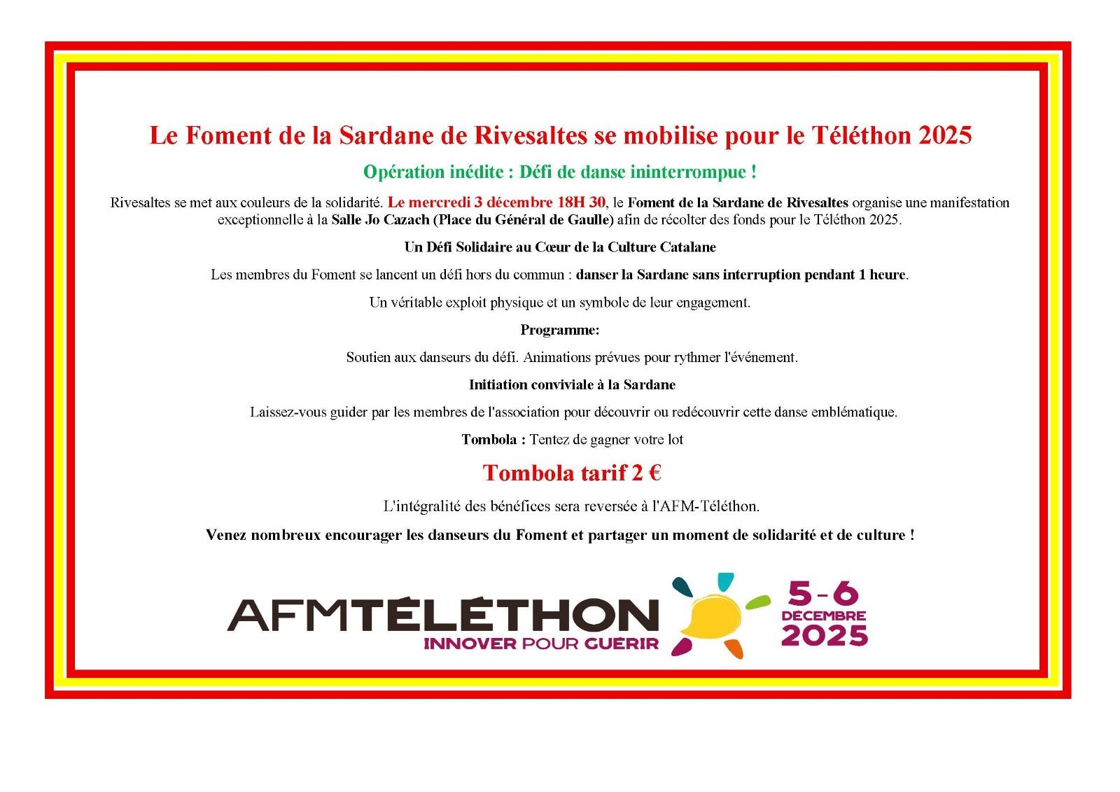Le Foment de la Sardana de Rivesaltes relève un défi inédit : danser une sardane de manière ininterrompue pendant une heure afin de soutenir le Téléthon 2025.