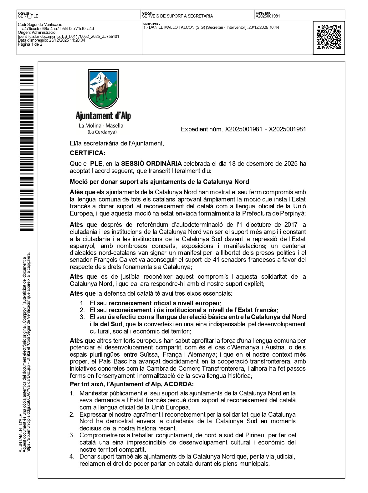 Le 18 décembre 2025, la mairie d’Alp a adopté la motion présentée par les Angelets de la Terra, visant à renforcer la défense de la langue catalane commune et à consolider les liens institutionnels entre la Catalogne Nord et la Catalogne Sud.