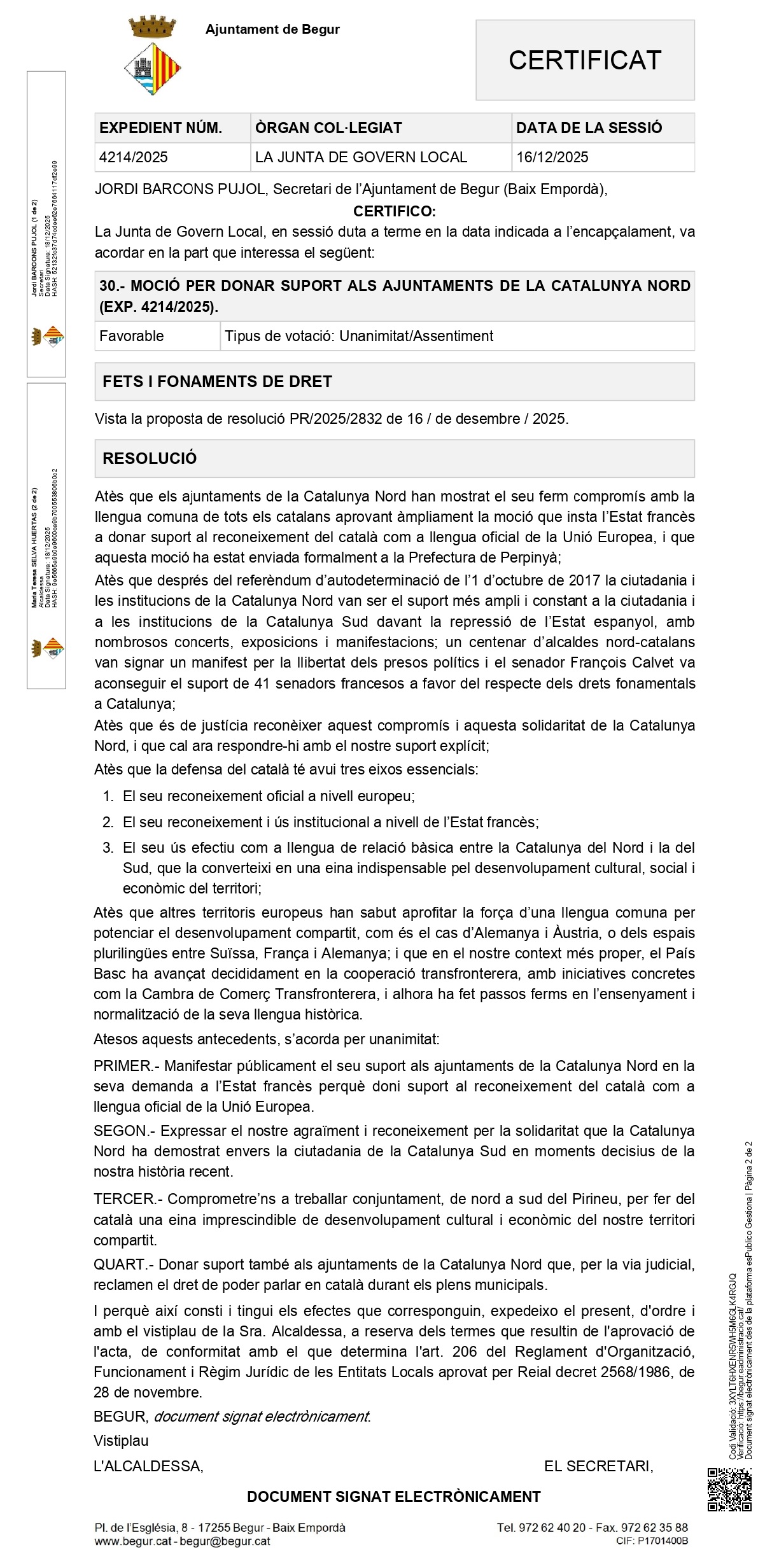 Le 16 décembre 2025, la mairie de Begur a adopté à l’unanimité la motion présentée par les Angelets de la Terra, visant à renforcer la défense de la langue catalane commune et à consolider les liens institutionnels entre la Catalogne Nord et la Catalogne Sud.