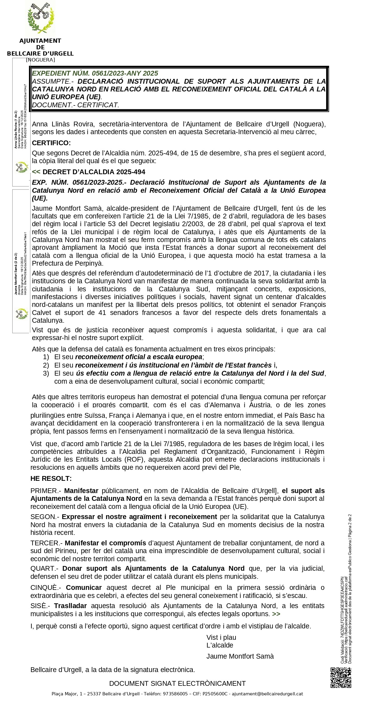Avec ce décret, Bellcaire d’Urgell rejoint pleinement les communes engagées dans la défense de la langue catalane commune et dans le renforcement des liens entre tous les territoires catalans.