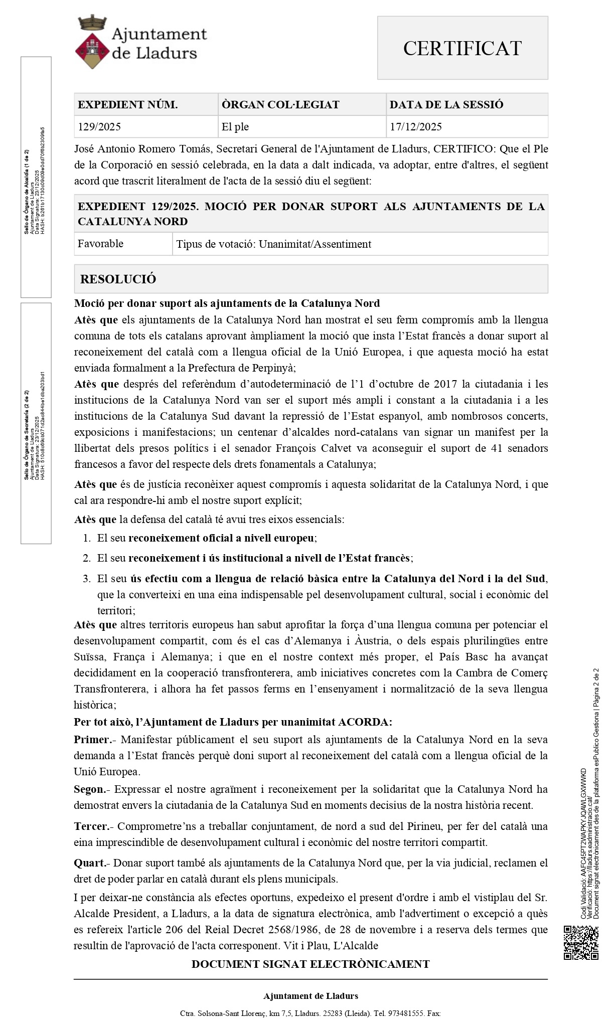Le 17 décembre 2025, la mairie de Lladurs a adopté à l’unanimité la motion présentée par les Angelets de la Terra, visant à renforcer la défense de la langue catalane commune et à consolider les liens institutionnels entre la Catalogne Nord et la Catalogne Sud.