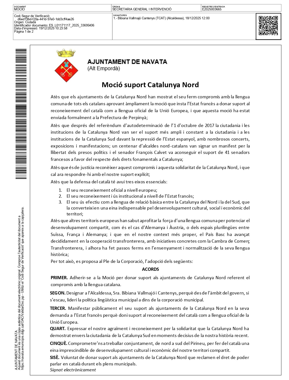Le 18 décembre 2025, la mairie de Navata a adopté la motion présentée par les Angelets de la Terra, visant à renforcer la défense de la langue catalane commune et à consolider les liens institutionnels entre la Catalogne Nord et la Catalogne Sud.
