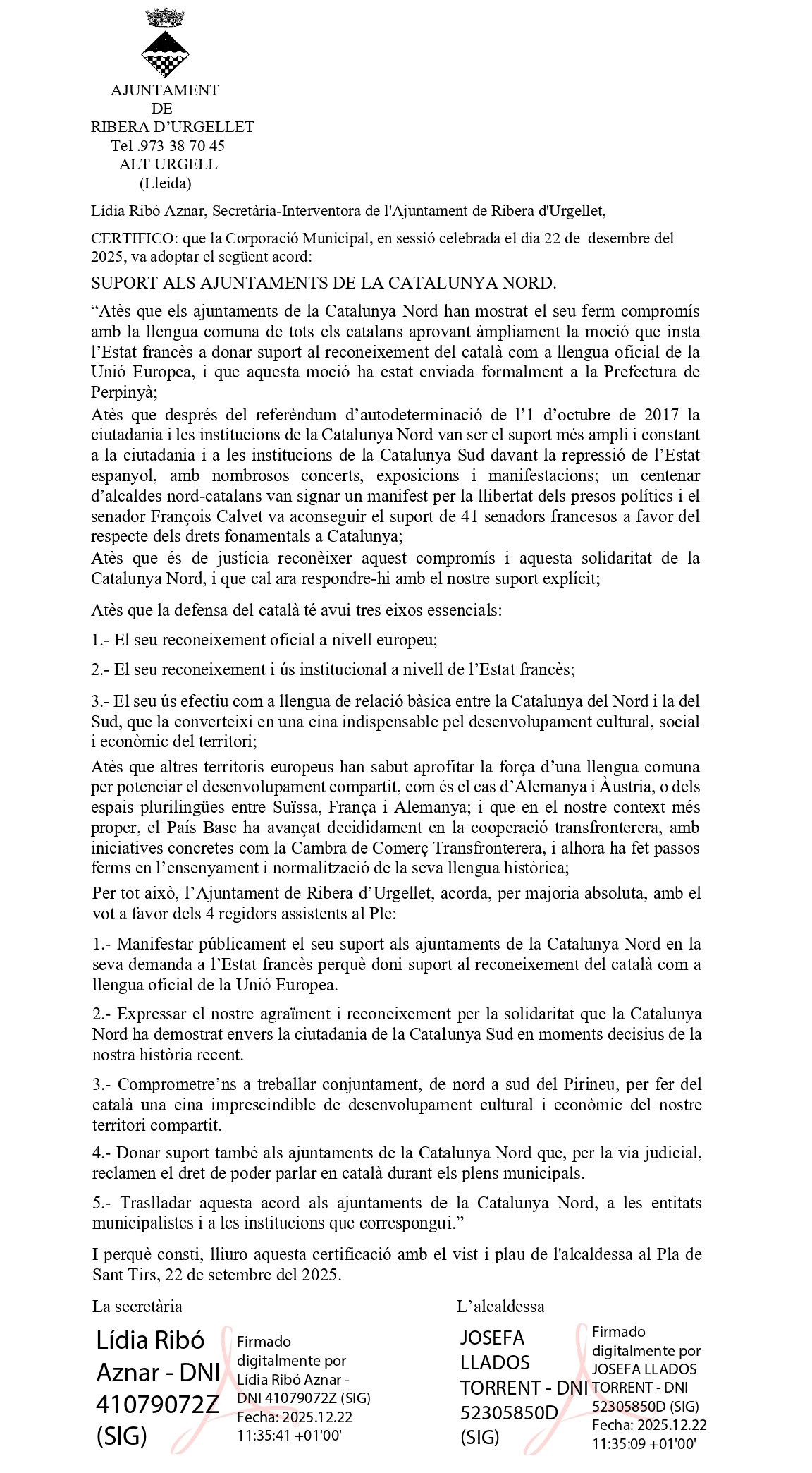 Le 22 décembre 2025, la mairie de Ribera d’Urgellet a approuvé la motion présentée par les Angelets de la Terra, visant à renforcer la défense de la langue catalane commune et à consolider les liens institutionnels entre la Catalogne Nord et la Catalogne Sud.