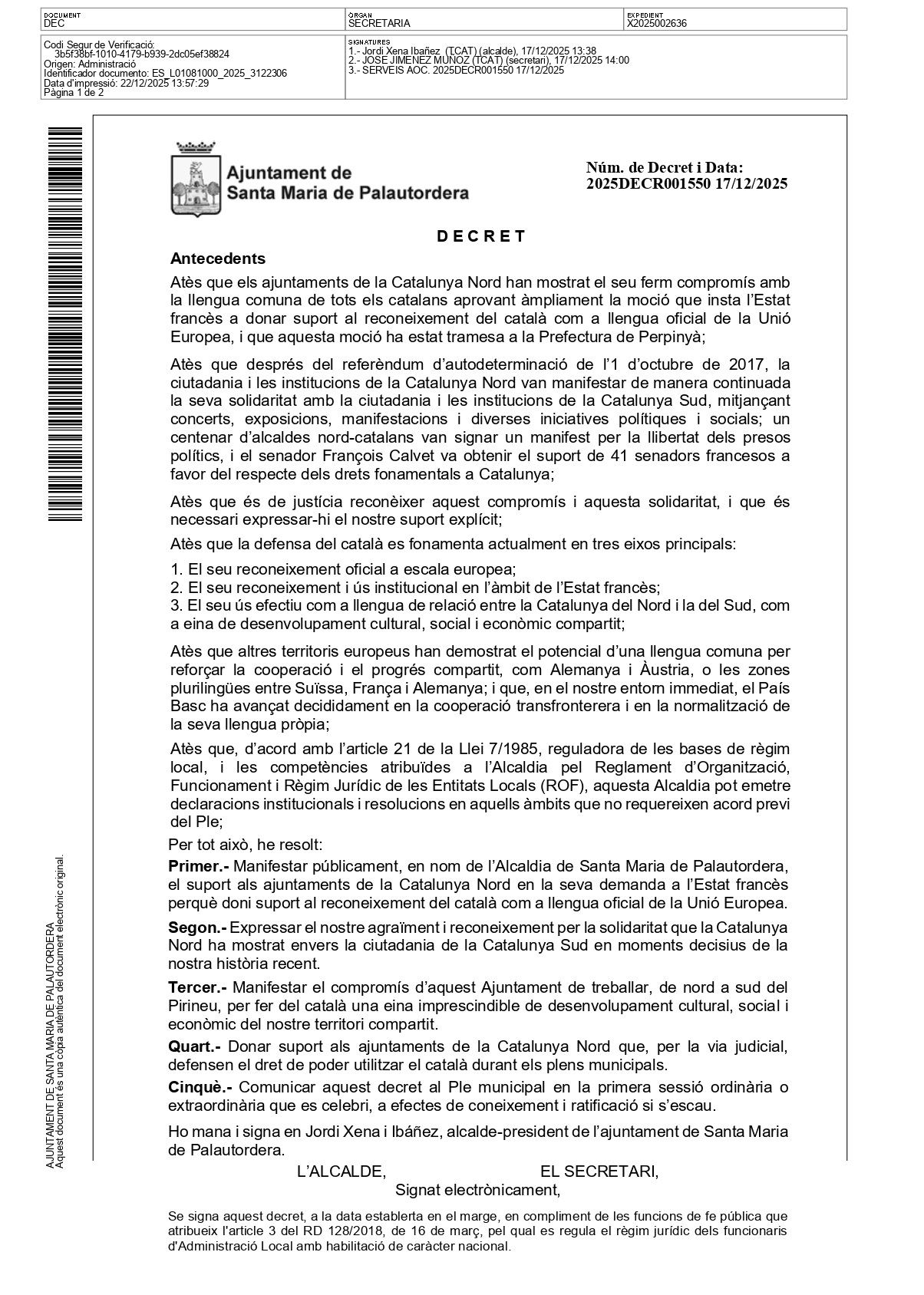 Par ce décret, Santa Maria de Palautordera rejoint le groupe croissant de communes engagées dans la défense de la langue catalane commune et le renforcement des liens entre les territoires catalans.