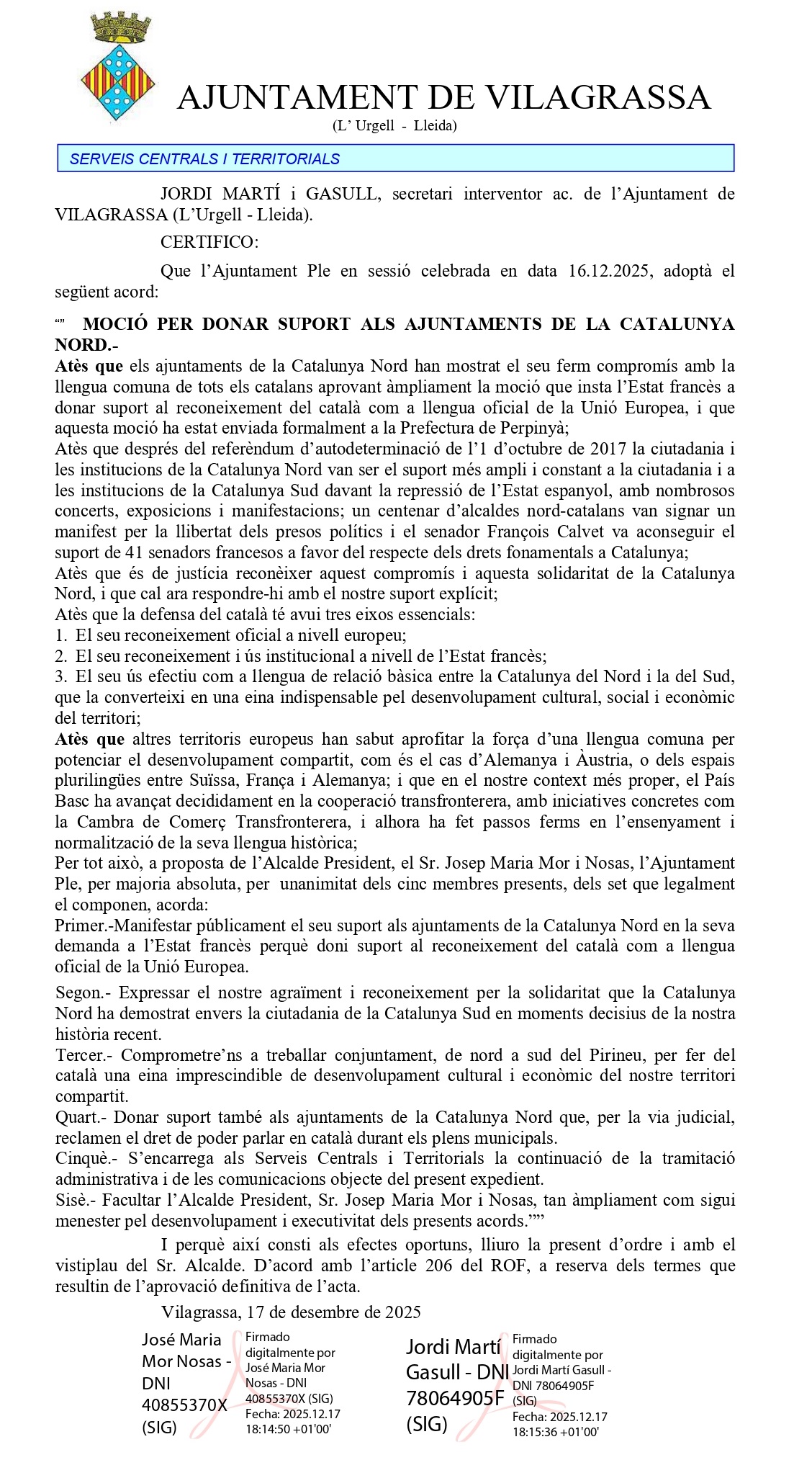 Avec cette adhésion, Vilagrassa rejoint le nombre croissant de communes engagées dans la défense de la langue catalane commune et dans le renforcement des liens entre tous les territoires du pays.