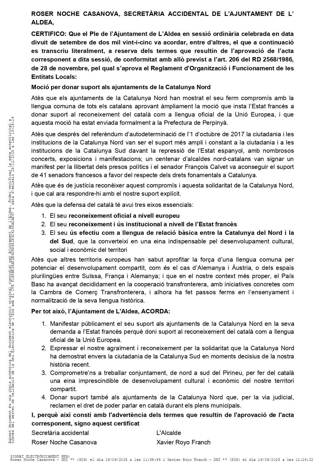 Le 23 novembre 2025, la mairie de L’Aldea a adopté la motion présentée par les Angelets de la Terra, avec pour objectif de renforcer la défense de la langue catalane commune et de consolider les liens institutionnels entre la Catalogne Nord et la Catalogne Sud.