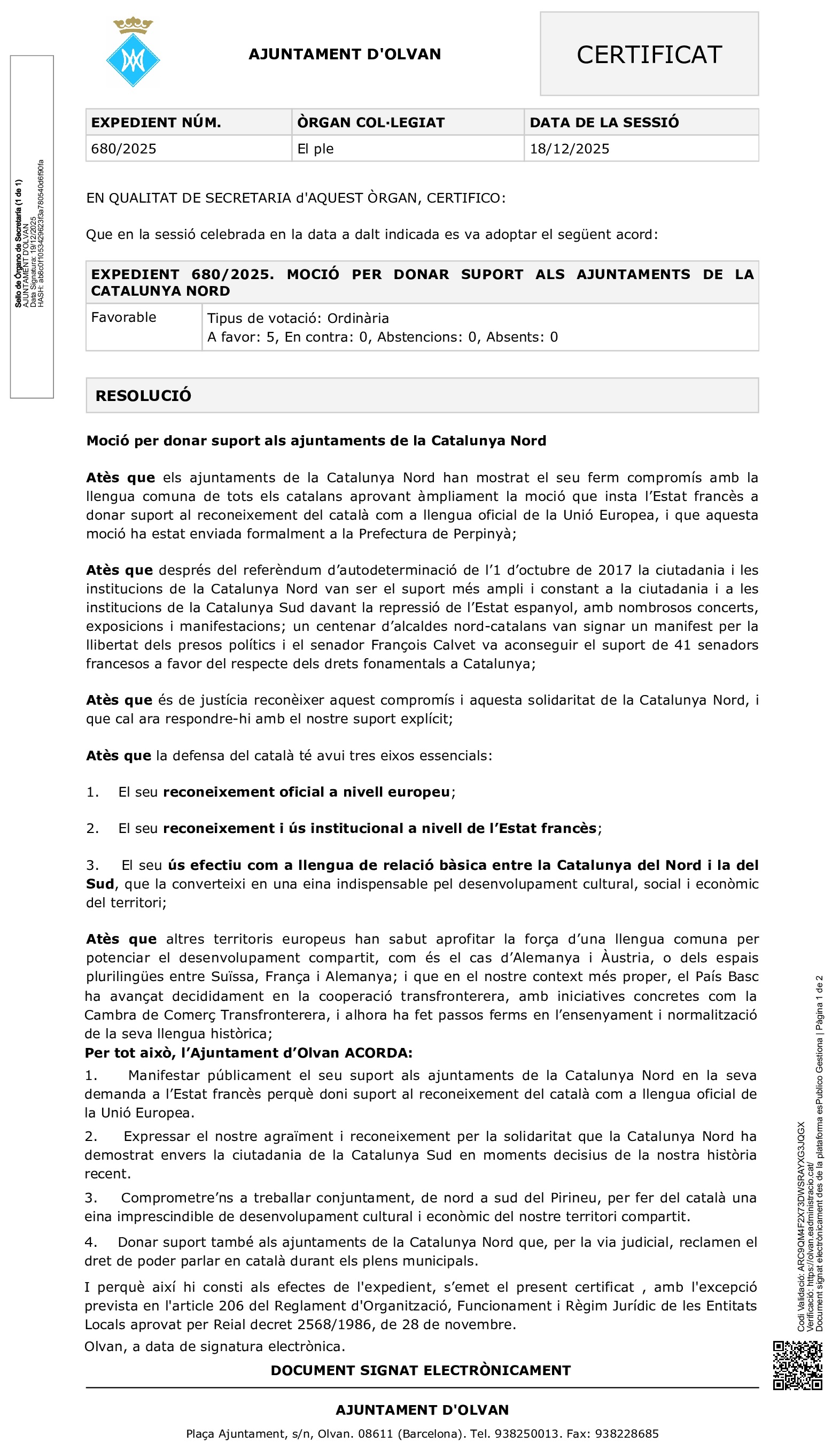 Avec cette approbation, Olvan rejoint l’ensemble des municipalités qui œuvrent pour la défense de la langue catalane commune et pour le renforcement des liens entre tous les territoires du pays.
