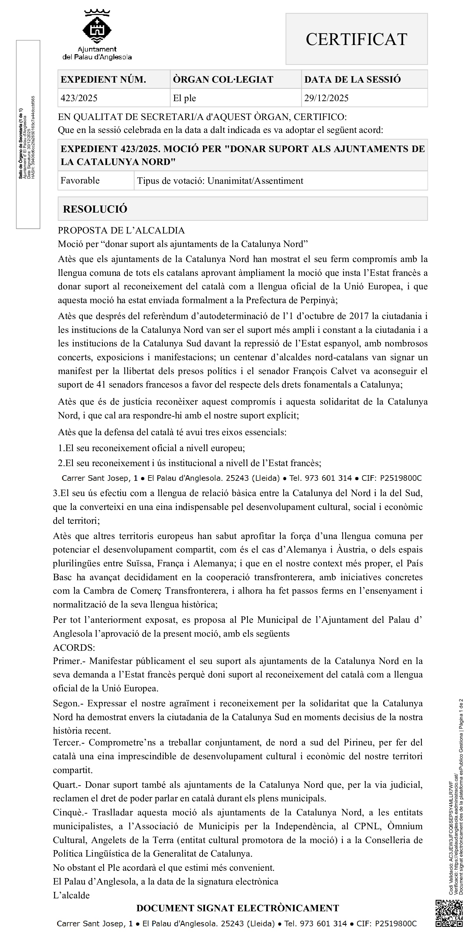 Le 29 décembre 2025, la mairie du Palau d’Anglesola a approuvé à l’unanimité la motion présentée par les Angelets de la Terra, avec pour objectif de renforcer la défense de la langue catalane commune et de consolider les liens institutionnels entre la Catalogne Nord et la Catalogne Sud.