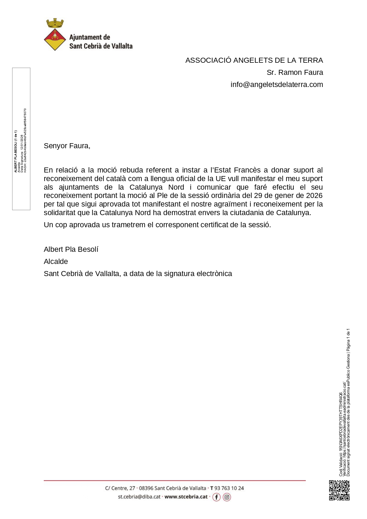 Sant Cebrià de Vallalta annonce qu’il votera la motion lors du conseil municipal du 29 janvier