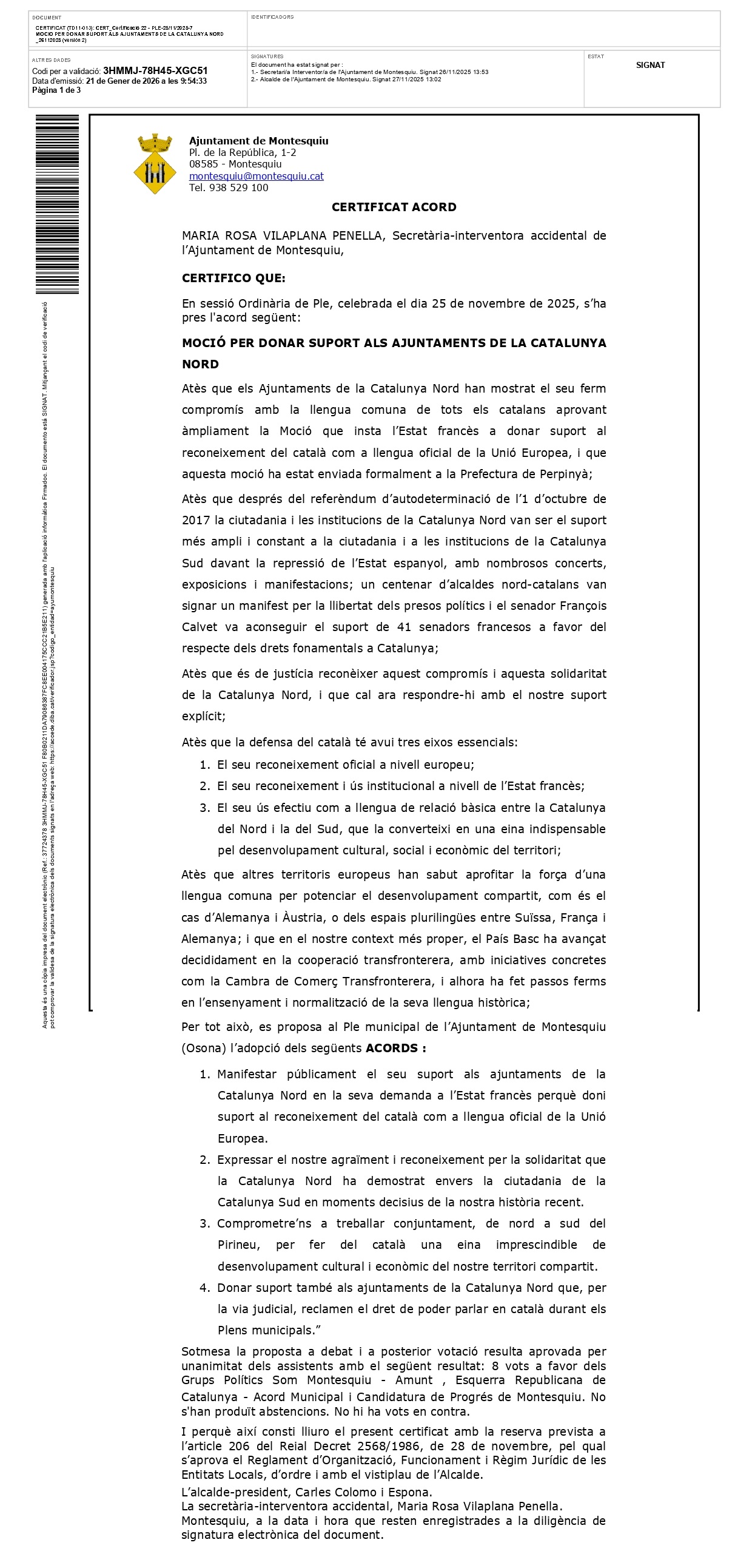 Montesquiu affirme son soutien au catalan et à la Catalogne Nord en approuvant la motion des Angelets de la Terra