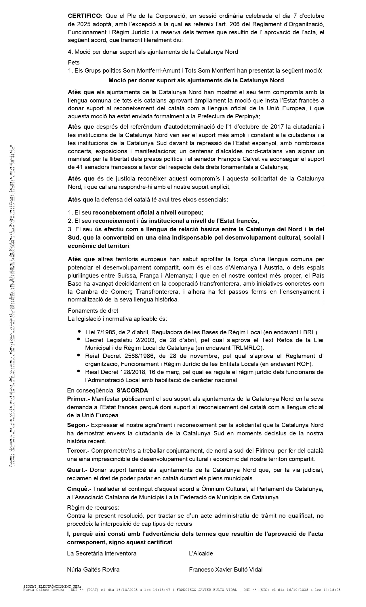 Montferri affirme son soutien au catalan et à la Catalogne Nord en approuvant la motion des Angelets de la Terra