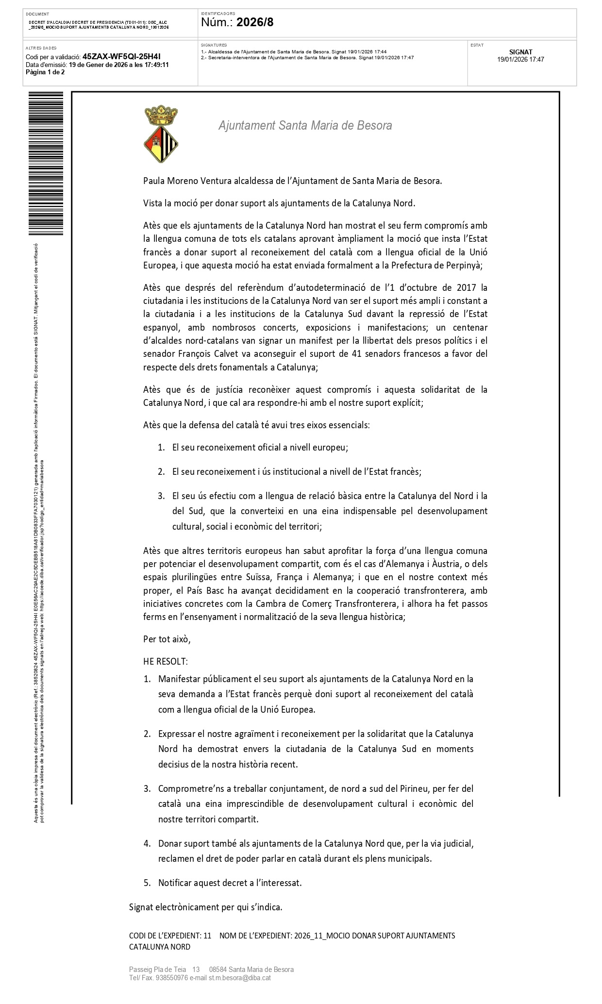 Le 19 janvier 2026, la mairie de Santa Maria de Besora a approuvé la motion présentée par les Angelets de la Terra pour renforcer la défense de la langue catalane commune et consolider les liens institutionnels entre la Catalogne Nord et la Catalogne Sud, dans le cadre de la campagne des Angelets de la Terra : « Une langue sans frontières ».